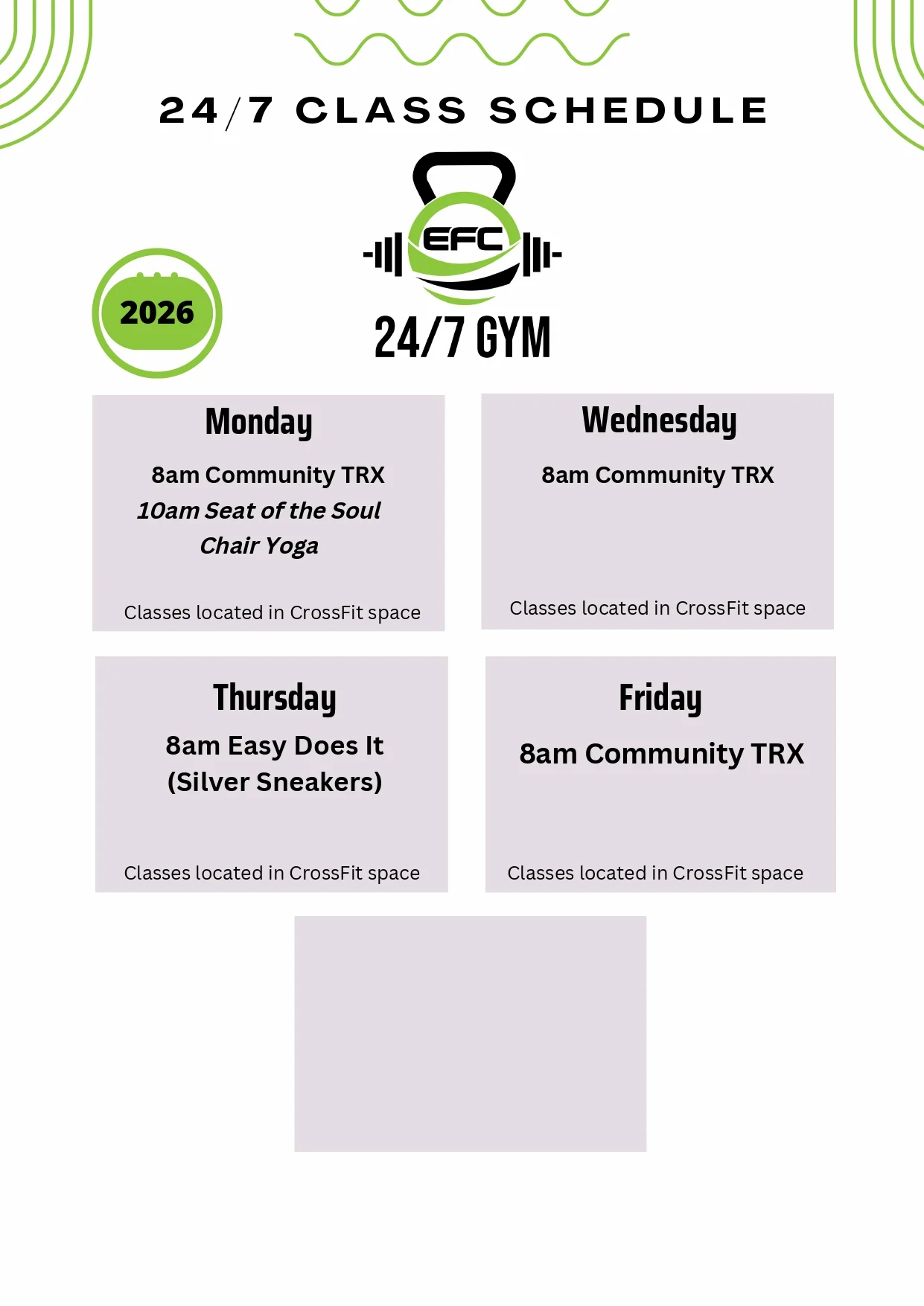 All of the below group classes are available to all 24/7 members. Please reference this schedule to plan out your next class with us.